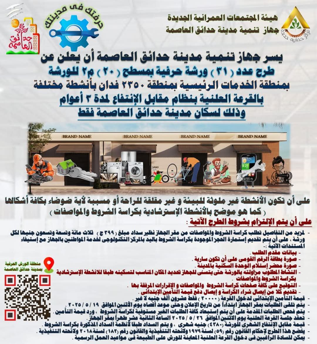 أعلن جهاز تنمية مدينة حدائق العاصمة عن طرح 31 ورشة حرفية بمسطح 20 م² للورشة بمنطقة الخدمات الرئيسية، بمساحة إجمالية 3250 م²، بنظام الانتفاع لمدة 3 سنوات، وذلك لسكان مدينة حدائق العاصمة فقط، كما هو موضح بالإعلان التالي: