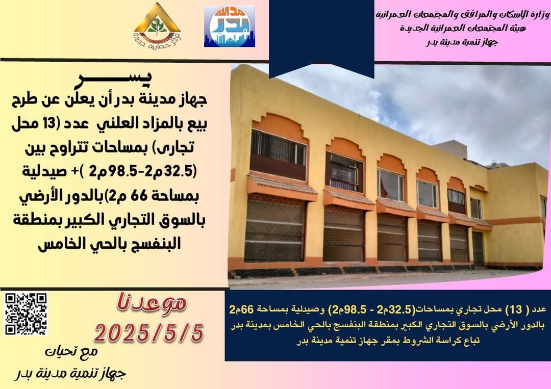 أعلن جهاز تنمية مدينة بدر عن طرح عدد 13 محلا تجاريا للبيع بالمزاد العلني، بمساحات متنوعة، وصيدلية، وذلك بعدد من الأسواق التجارية بالمدينة، في إطار توفير خدمات متنوعة وتلبية احتياجات السكان وتعزيز النشاط التجاري بالمنطقة.