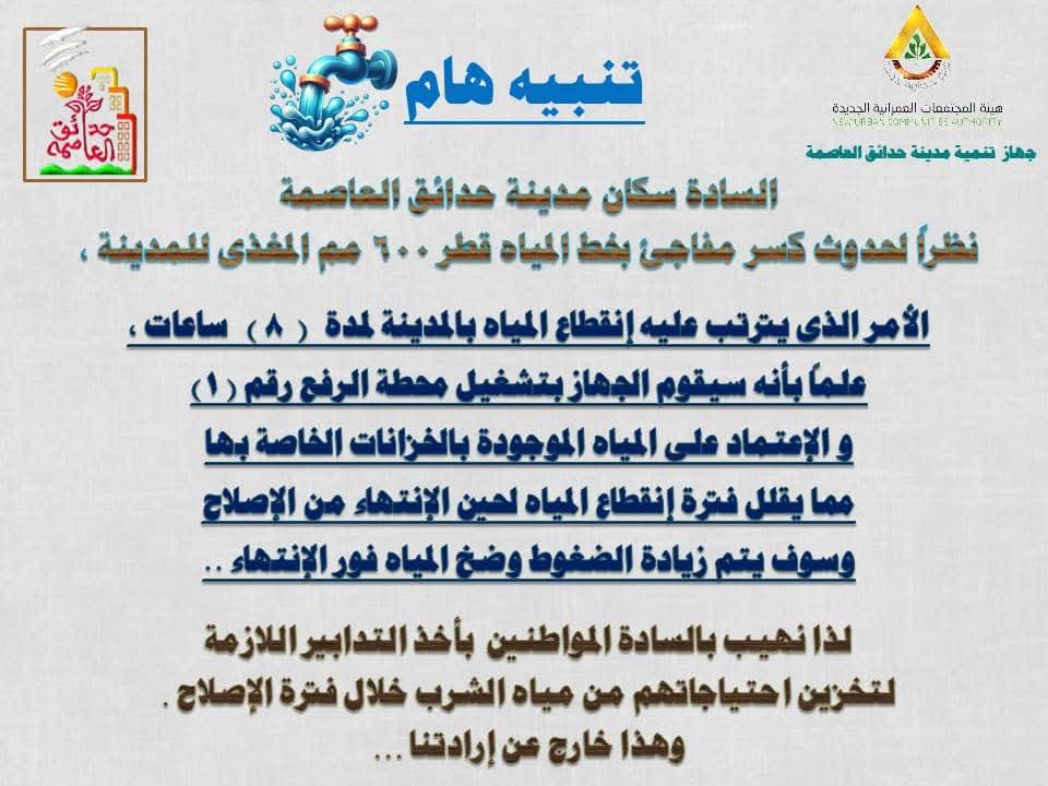 أعلن جهاز تنمية مدينة حدائق العاصمة عن حدوث كسر مفاجئ بخط المياه الرئيسي المغذي للمدينة بقطر 600 مم، مما سيؤدي إلى انقطاع المياه عن المدينة لمدة 8 ساعات.. وسيتم التشغيل كما هو موضح بالمنشور: