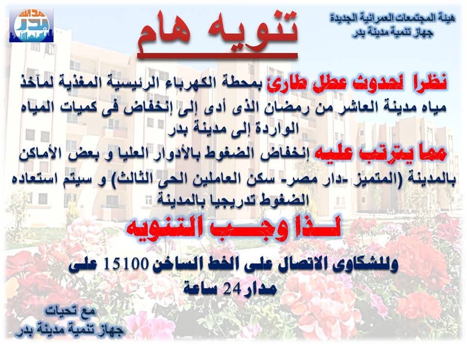 ينوه جهاز مدينة بدر  بأنه نظرا لوجود عطل مفاجئ بمحطة الكهرباء الرئيسية المغذية لمآخذ المياه.. ما ترتب عليه ضعف وصول المياه للأدوار العليا ببعض الأماكن بالمدينة.. وعليه إليكم هذا التنويه