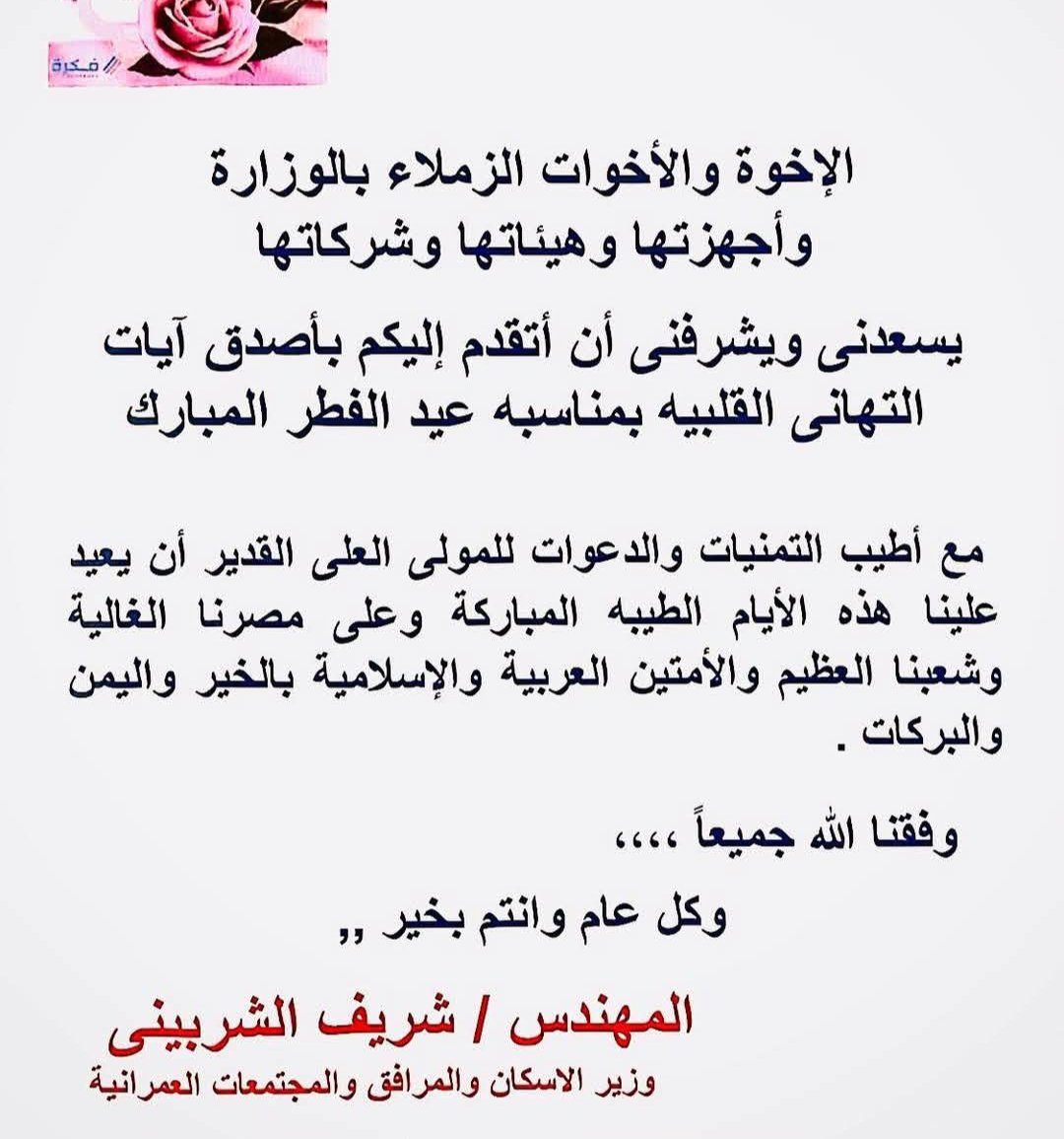 وجه المهندس شريف الشربيني، وزير الإسكان والمرافق والمجتمعات العمرانية، رسالة تهنئة إلى جميع العاملين بالوزارة وأجهزتها وهيئاتها وشركاتها، بمناسبة حلول عيد الفطر المبارك، متمنيًا لهم دوام التوفيق والنجاح.