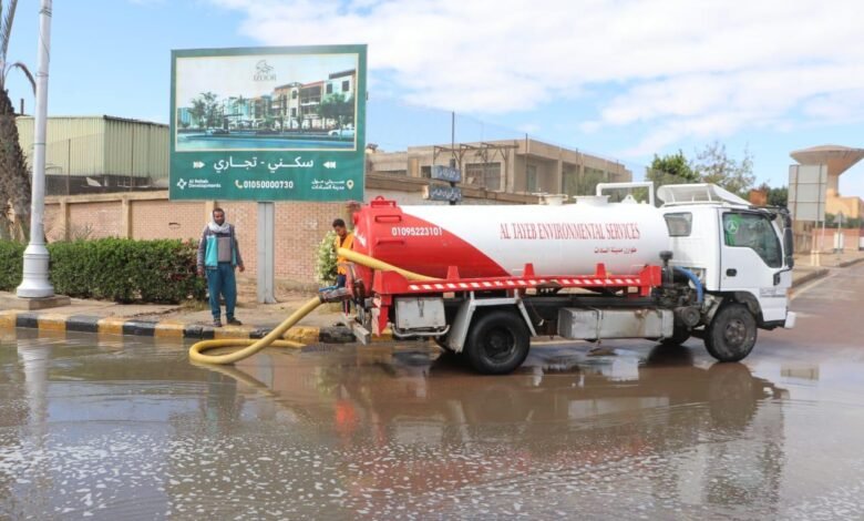 وفي مدينة السويس الجديدة، تمت متابعة أعمال سحب وشفط مياه الأمطار ميدانياً، والتأكد من كفاءة شبكات التصريف وانتظام عملها، مع الدفع بفرق العمل والمعدات إلى المناطق الحيوية، ومنها الطريق الساحلي والحي الصناعي والمنطقة الحرة، للتعامل الفوري مع تجمعات المياه.