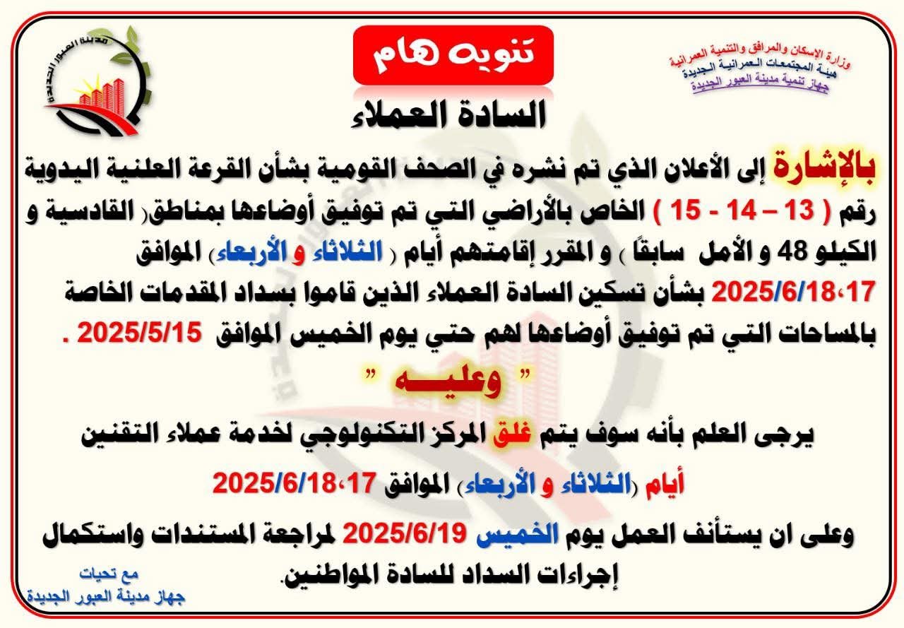 وأوضح الجهاز أن هذا الإجراء يأتي بالتزامن مع إجراء القرعة العلنية اليدوية أرقام (13 – 14 – 15)، الخاصة بالأراضي التي تم توفيق أوضاعها بمناطق القادسية والكيلو 48 والأمل سابقًا، وذلك ضمن عملية تسكين السادة العملاء الذين قاموا بسداد المقدمات الخاصة بالمساحات التي تم توفيق أوضاعها لهم حتى يوم الخميس الموافق 15 مايو 2025.