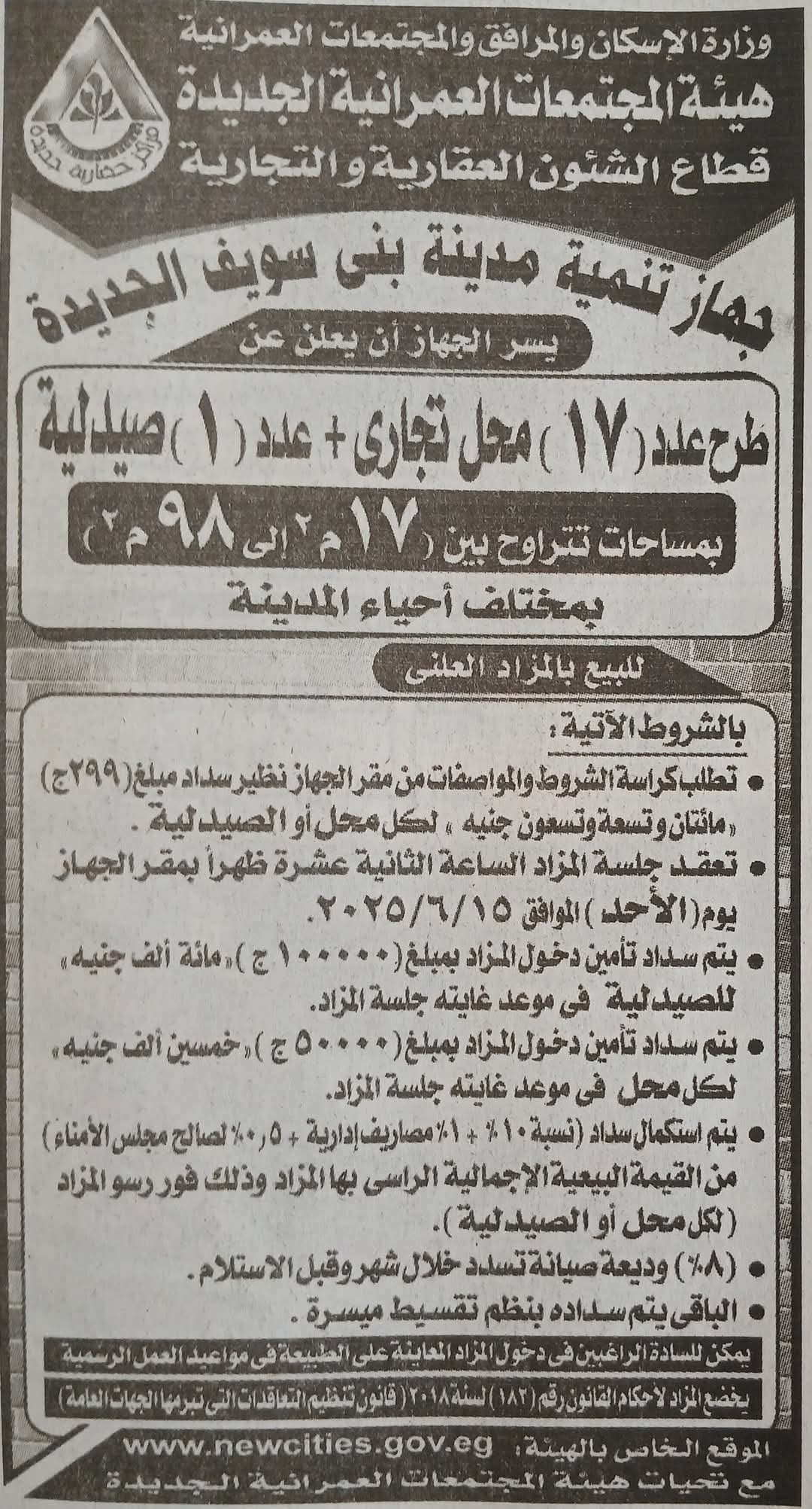 في إطار حرص جهاز تنمية مدينة بني سويف الجديدة على توفير مختلف الخدمات لسكان المدينة، واستكمالًا لما سبق الإعلان عنه، أعلن الجهاز عن طرح عدد 17 محلًا تجاريًا وصيدلية واحدة بمساحات تتراوح بين 17 مترًا مربعًا وحتى 98 مترًا مربعًا، وذلك للبيع بالمزاد العلني يوم الأحد الموافق 15 يونيو 2025 في تمام الساعة 12 ظهرًا بمقر الجهاز.