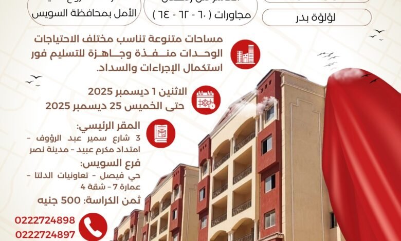 وأضافت الهيئة أن الوحدات منفذة وجاهزة للتسليم فور الانتهاء من الإجراءات والسداد، ويمكن معرفة كافة الشروط والمواصفات والمبالغ المالية من خلال الحصول على كراسة الشروط والمواصفات اعتباراً من يوم الاثنين الموافق 1/12/2025، وحتى يوم الخميس الموافق 25/12/2025 ، وذلك بمقر الهيئة الرئيسي بالعنوان : 3 ش سمير عبد الرؤوف – امتداد مكرم عبيد – مدينة نصر أو بمقر فرع الهيئة بمحافظة السويس بالعنوان حي فيصل – تعاونيات الدلتا – عمارة ٧ – شقة 4.