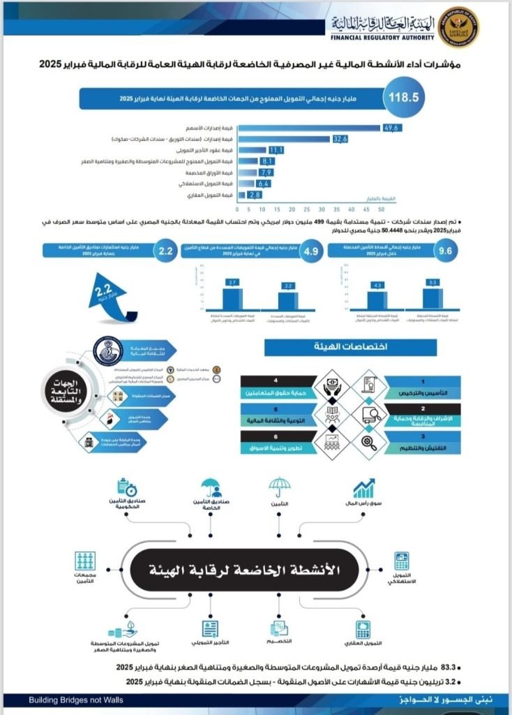 118.5 مليار جنيه حجم التمويلات الممنوحة عبر الجهات الخاضعة لرقابة الهيئة العامة للرقابة المالية خلال فبراير